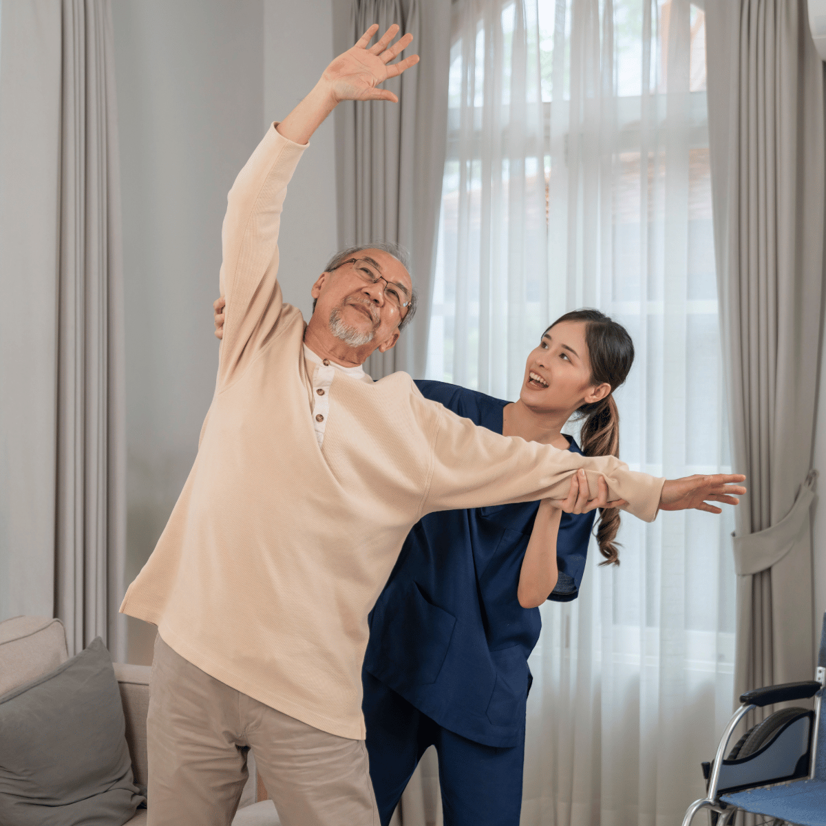 นักกายภาพบำบัดวิชาชีพมาถึงบ้าน ประเมินฟังก์ชัน วางเป้าหมาย ฟื้นฟูด้วยโปรแกรมเฉพาะบุคคล ฝึกเดิน บริหารข้อต่อ ทรงตัว สอนท่าบริหารที่ทำเองได้ ปรับสิ่งแวดล้อมในบ้าน แนะนำอุปกรณ์ช่วยเดิน และติดตามผลอย่างต่อเนื่องค่ะ