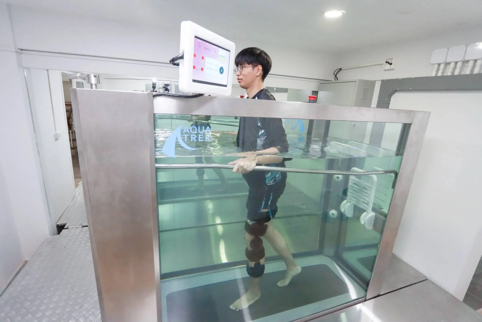 น้ำลดน้ำหนักตัว 50-80% ผู้ป่วยฝึกเดินในน้ำได้เร็วกว่าบนบก 2-3 สัปดาห์ Aquatic Treadmill KIN ควบคุมระดับน้ำและความเร็วได้ทีละขั้น
